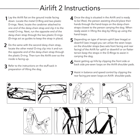 Lifting onto the primary carrier's back – The second person can assist in lifting the dog onto the primary carrier's back. To do this, find the metal o-rings along the front side of the Airlift, clip the carabiner to the o-ring located in the middle of the Airlift, then thread the other end of the daisy-chain strap through the other o-rings that act as guides to prevent the straps from moving around and potentially harming the dog.