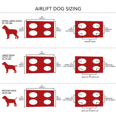 XL Size: 70 - 150 lbs., 17 - 24 inches from back leg to front leg (consider the Airlift XL-2 package, which includes additional accessories)